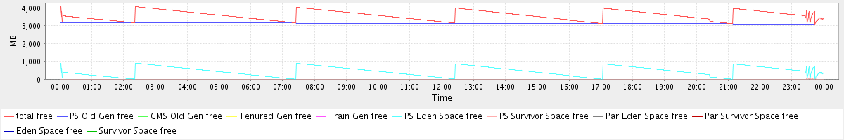 avg(total free) = 3583.79 avg(PS Old Gen free) = 3134.41 avg(CMS Old Gen free) = 0.00 avg(Tenured Gen free) = 0.00 avg(Train Gen free) = 0.00 avg(PS Eden Space free) = 449.14 avg(PS Survivor Space free) = 0.23 avg(Par Eden Space free) = 0.00 avg(Par Survivor Space free) = 0.00 avg(Eden Space free) = 0.00 avg(Survivor Space free) = 0.00