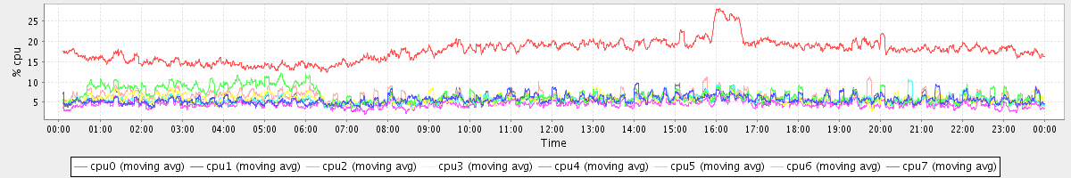 avg(cpu0) = 1.42 avg(cpu1) = 0.13 avg(cpu2) = 0.18 avg(cpu3) = 0.11 avg(cpu4) = 0.08 avg(cpu5) = 0.09 avg(cpu6) = 0.13 avg(cpu7) = 0.09