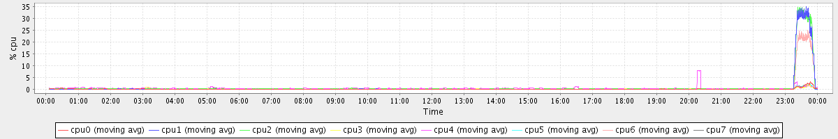 avg(cpu0) = 0.60 avg(cpu1) = 0.46 avg(cpu2) = 0.35 avg(cpu3) = 0.37 avg(cpu4) = 0.28 avg(cpu5) = 0.24 avg(cpu6) = 0.21 avg(cpu7) = 0.15