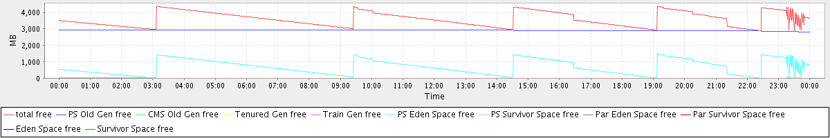 avg(total free) = 3598.86 avg(PS Old Gen free) = 2912.42 avg(CMS Old Gen free) = 0.00 avg(Tenured Gen free) = 0.00 avg(Train Gen free) = 0.00 avg(PS Eden Space free) = 677.56 avg(PS Survivor Space free) = 8.88 avg(Par Eden Space free) = 0.00 avg(Par Survivor Space free) = 0.00 avg(Eden Space free) = 0.00 avg(Survivor Space free) = 0.00