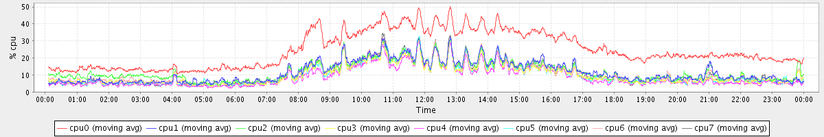 avg(cpu0) = 24.55 avg(cpu1) = 11.61 avg(cpu2) = 12.05 avg(cpu3) = 10.23 avg(cpu4) = 8.84 avg(cpu5) = 10.07 avg(cpu6) = 11.06 avg(cpu7) = 10.62