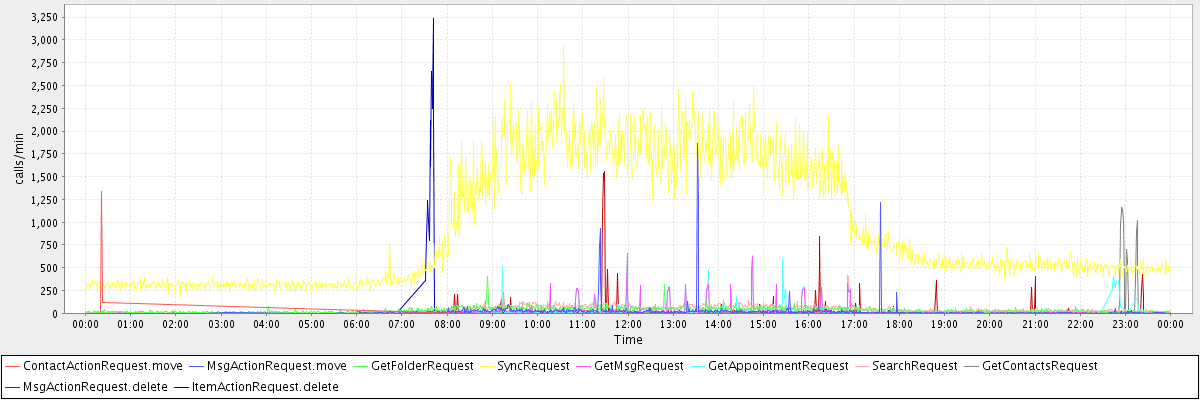 max(ContactActionRequest.move) = 1333.00 max(MsgActionRequest.move) = 1863.00 max(GetFolderRequest) = 400.00 max(SyncRequest) = 2946.00 max(GetMsgRequest) = 655.00 max(GetAppointmentRequest) = 646.00 max(SearchRequest) = 413.00 max(GetContactsRequest) = 1157.00 max(MsgActionRequest.delete) = 1561.00 max(ItemActionRequest.delete) = 3232.00
