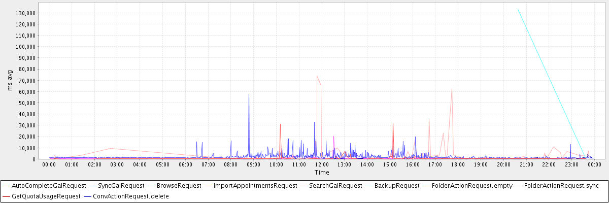 avg(AutoCompleteGalRequest) = 871.67 avg(SyncGalRequest) = 2290.16 avg(BrowseRequest) = 485.67 avg(ImportAppointmentsRequest) = 2377.00 avg(SearchGalRequest) = 906.03 avg(BackupRequest) = 67190.00 avg(FolderActionRequest.empty) = 4510.98 avg(FolderActionRequest.sync) = 7071.00 avg(GetQuotaUsageRequest) = 3334.00 avg(ConvActionRequest.delete) = 474.84