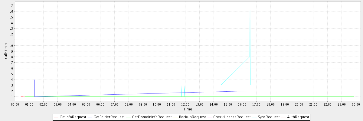 max(GetInfoRequest) = 1.00 max(GetFolderRequest) = 4.00 max(GetDomainInfoRequest) = 1.00 max(BackupRequest) = 1.00 max(CheckLicenseRequest) = 1.00 max(SyncRequest) = 17.00 max(AuthRequest) = 1.00