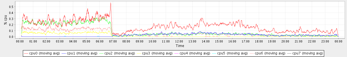 avg(cpu0) = 1.63 avg(cpu1) = 0.19 avg(cpu2) = 0.27 avg(cpu3) = 0.14 avg(cpu4) = 0.13 avg(cpu5) = 0.13 avg(cpu6) = 0.19 avg(cpu7) = 0.11