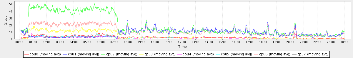 avg(cpu0) = 2.13 avg(cpu1) = 0.52 avg(cpu2) = 0.56 avg(cpu3) = 0.44 avg(cpu4) = 0.30 avg(cpu5) = 0.42 avg(cpu6) = 0.50 avg(cpu7) = 0.44