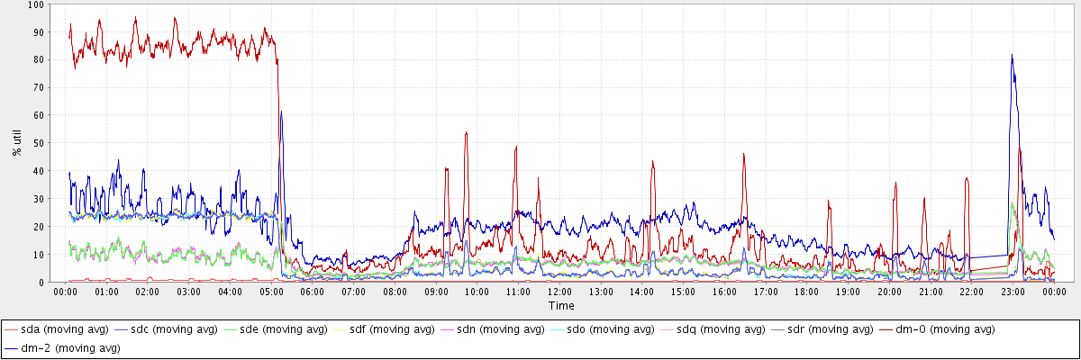 avg(sda) = 0.37 avg(sdc) = 7.57 avg(sde) = 6.72 avg(sdf) = 7.52 avg(sdn) = 6.72 avg(sdo) = 7.51 avg(sdq) = 6.74 avg(sdr) = 7.50 avg(dm-0) = 27.44 avg(dm-2) = 19.64