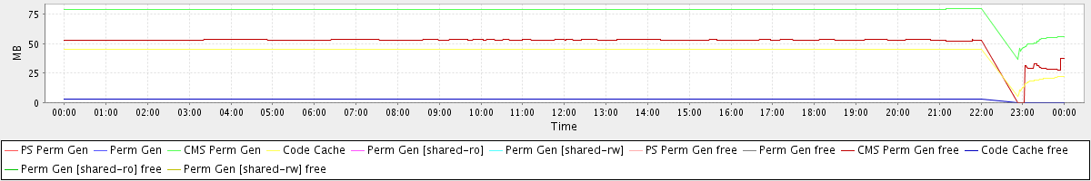 avg(PS Perm Gen) = 0.00 avg(Perm Gen) = 0.00 avg(CMS Perm Gen) = 77.69 avg(Code Cache) = 43.67 avg(Perm Gen [shared-ro]) = 0.00 avg(Perm Gen [shared-rw]) = 0.00 avg(PS Perm Gen free) = 0.00 avg(Perm Gen free) = 0.00 avg(CMS Perm Gen free) = 51.83 avg(Code Cache free) = 2.58 avg(Perm Gen [shared-ro] free) = 0.00 avg(Perm Gen [shared-rw] free) = 0.00