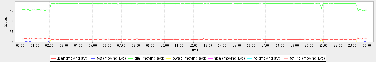 avg(user) = 7.22 avg(sys) = 0.76 avg(idle) = 90.36 avg(iowait) = 1.65 avg(nice) = 0.00 avg(irq) = 0.00 avg(softirq) = 0.02