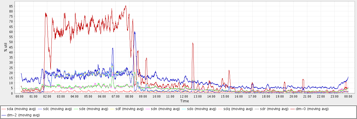 avg(sda) = 1.33 avg(sdc) = 6.05 avg(sde) = 4.23 avg(sdf) = 6.04 avg(sdn) = 4.23 avg(sdo) = 6.02 avg(sdq) = 4.20 avg(sdr) = 6.00 avg(dm-0) = 21.56 avg(dm-2) = 12.36