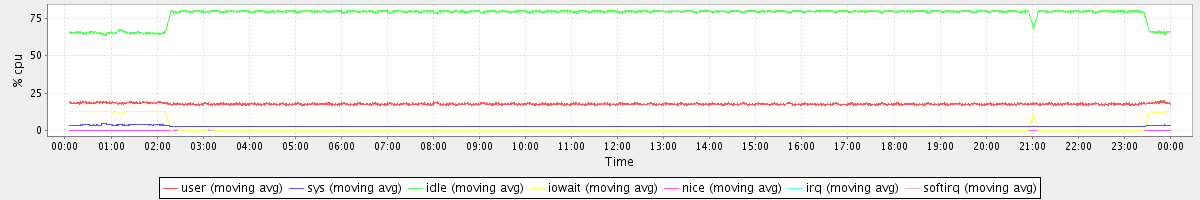 avg(user) = 17.64 avg(sys) = 2.84 avg(idle) = 77.92 avg(iowait) = 1.59 avg(nice) = 0.00 avg(irq) = 0.00 avg(softirq) = 0.01