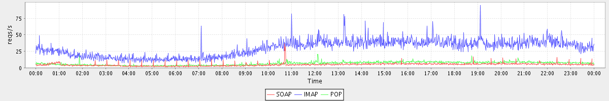 Host zm01.stanford.edu: Mailboxd: Request Rate by Client Protocol