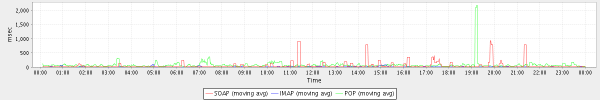 avg(SyncGalRequest) = 1143.24 avg(BackupQueryRequest) = 190.00 avg(GetFreeBusyRequest) = 222.14 avg(GetQuotaUsageRequest) = 3392.00 avg(ConvActionRequest.delete) = 179.84 avg(DeleteAccountRequest) = 33210.67 avg(SendMsgRequest) = 200.21 avg(BackupRequest) = 14614.00 avg(FolderActionRequest.empty) = 1456.59 avg(FolderActionRequest.read) = 355.00