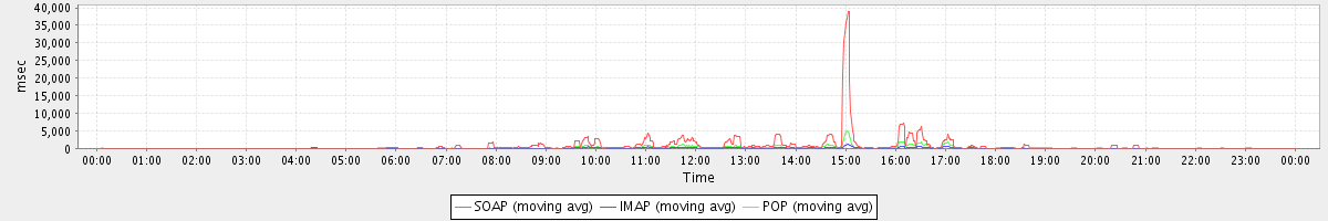 avg(AutoCompleteGalRequest) = 4315.25 avg(SyncGalRequest) = 10058.09 avg(FolderActionRequest.delete) = 7637.17 avg(CancelAppointmentRequest) = 3990.84 avg(SearchGalRequest) = 3864.24 avg(BackupAccountQueryRequest) = 8594.00 avg(BackupRequest) = 13527.00 avg(CancelTaskRequest) = 38419.00 avg(CreateTagRequest) = 5163.75 avg(CreateMountpointRequest) = 5182.18