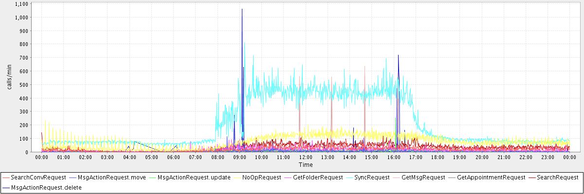 max(SearchConvRequest) = 90.00 max(MsgActionRequest.move) = 470.00 max(MsgActionRequest.update) = 250.00 max(NoOpRequest) = 234.00 max(GetFolderRequest) = 94.00 max(SyncRequest) = 811.00 max(GetMsgRequest) = 637.00 max(GetAppointmentRequest) = 617.00 max(SearchRequest) = 142.00 max(MsgActionRequest.delete) = 1060.00