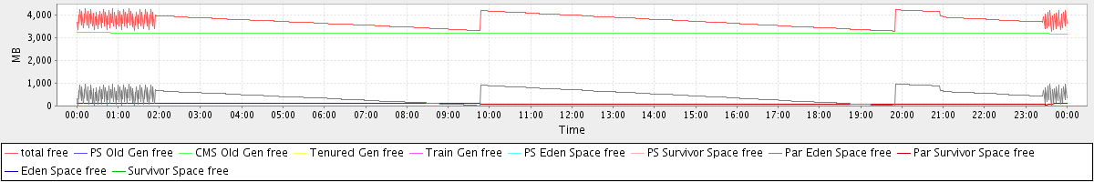 avg(total free) = 3724.07 avg(PS Old Gen free) = 0.00 avg(CMS Old Gen free) = 3177.29 avg(Tenured Gen free) = 0.00 avg(Train Gen free) = 0.00 avg(PS Eden Space free) = 0.00 avg(PS Survivor Space free) = 0.00 avg(Par Eden Space free) = 453.56 avg(Par Survivor Space free) = 93.22 avg(Eden Space free) = 0.00 avg(Survivor Space free) = 0.00