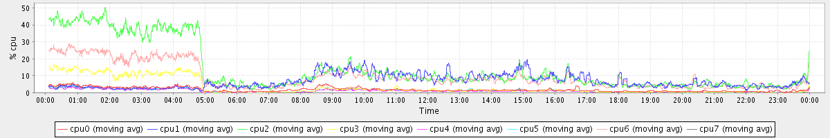 avg(cpu0) = 24.91 avg(cpu1) = 11.98 avg(cpu2) = 11.68 avg(cpu3) = 11.28 avg(cpu4) = 8.75 avg(cpu5) = 10.35 avg(cpu6) = 11.34 avg(cpu7) = 10.30