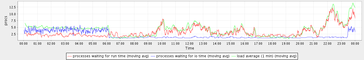 avg(processes waiting for run time) = 2.69 avg(processes waiting for io time) = 1.27 avg(load average (1 min)) = 4.12