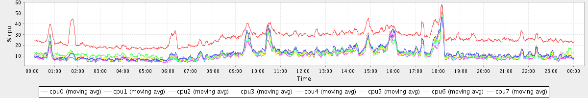 avg(cpu0) = 26.71 avg(cpu1) = 12.67 avg(cpu2) = 12.37 avg(cpu3) = 11.31 avg(cpu4) = 9.76 avg(cpu5) = 10.33 avg(cpu6) = 12.45 avg(cpu7) = 11.77