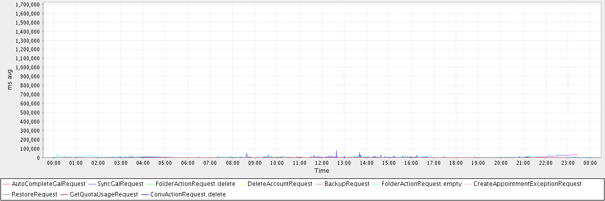 avg(AutoCompleteGalRequest) = 398.45 avg(SyncGalRequest) = 2037.24 avg(FolderActionRequest.delete) = 894.88 avg(DeleteAccountRequest) = 4925.00 avg(BackupRequest) = 16936.50 avg(FolderActionRequest.empty) = 5141.06 avg(CreateAppointmentExceptionRequest) = 494.06 avg(RestoreRequest) = 1642290.00 avg(GetQuotaUsageRequest) = 3416.00 avg(ConvActionRequest.delete) = 408.82