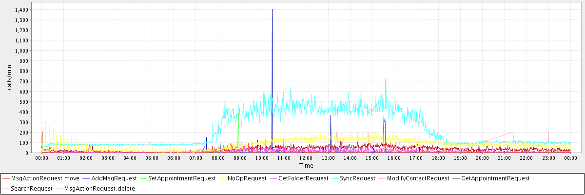 max(MsgActionRequest.move) = 175.00 max(AddMsgRequest) = 362.00 max(SetAppointmentRequest) = 384.00 max(NoOpRequest) = 307.00 max(GetFolderRequest) = 109.00 max(SyncRequest) = 727.00 max(ModifyContactRequest) = 206.00 max(GetAppointmentRequest) = 91.00 max(SearchRequest) = 212.00 max(MsgActionRequest.delete) = 1403.00