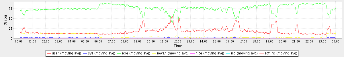 avg(user) = 17.51 avg(sys) = 1.29 avg(idle) = 75.69 avg(iowait) = 5.12 avg(nice) = 0.00 avg(irq) = 0.03 avg(softirq) = 0.35