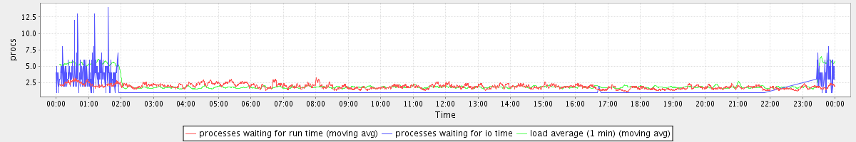 avg(processes waiting for run time) = 1.93 avg(processes waiting for io time) = 0.39 avg(load average (1 min)) = 2.19
