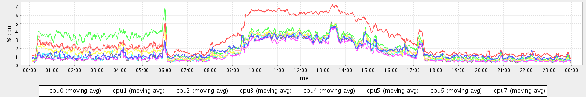 avg(cpu0) = 6.51 avg(cpu1) = 0.33 avg(cpu2) = 0.43 avg(cpu3) = 0.35 avg(cpu4) = 0.19 avg(cpu5) = 0.32 avg(cpu6) = 0.36 avg(cpu7) = 0.31