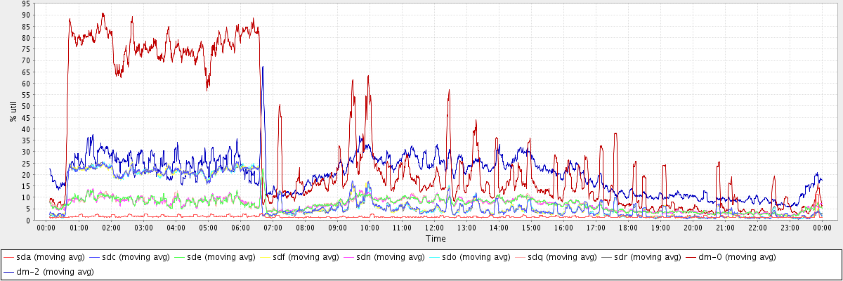 avg(sda) = 1.52 avg(sdc) = 8.42 avg(sde) = 6.82 avg(sdf) = 8.37 avg(sdn) = 6.85 avg(sdo) = 8.33 avg(sdq) = 6.89 avg(sdr) = 8.35 avg(dm-0) = 30.24 avg(dm-2) = 19.96