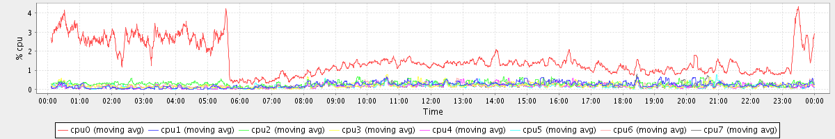 avg(cpu0) = 1.55 avg(cpu1) = 0.23 avg(cpu2) = 0.29 avg(cpu3) = 0.19 avg(cpu4) = 0.15 avg(cpu5) = 0.15 avg(cpu6) = 0.21 avg(cpu7) = 0.15