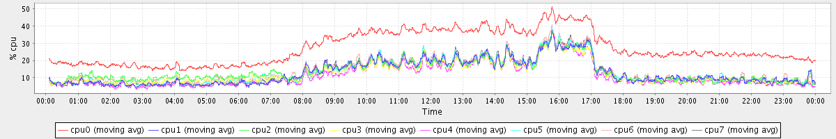 avg(cpu0) = 2.33 avg(cpu1) = 7.32 avg(cpu2) = 17.92 avg(cpu3) = 4.36 avg(cpu4) = 1.43 avg(cpu5) = 1.86 avg(cpu6) = 11.64 avg(cpu7) = 1.77