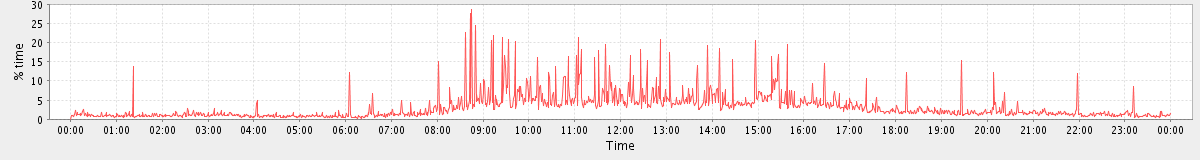 avg(user) = 12.69 avg(sys) = 1.38 avg(idle) = 80.28 avg(iowait) = 5.19 avg(nice) = 0.00 avg(irq) = 0.05 avg(softirq) = 0.43