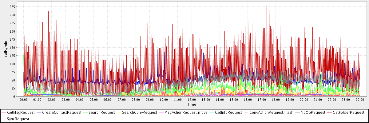 max(GetMsgRequest) = 35.00 max(CreateContactRequest) = 33.00 max(SearchRequest) = 126.00 max(SearchConvRequest) = 55.00 max(MsgActionRequest.move) = 27.00 max(GetInfoRequest) = 22.00 max(ConvActionRequest.trash) = 47.00 max(NoOpRequest) = 142.00 max(GetFolderRequest) = 278.00 max(SyncRequest) = 144.00