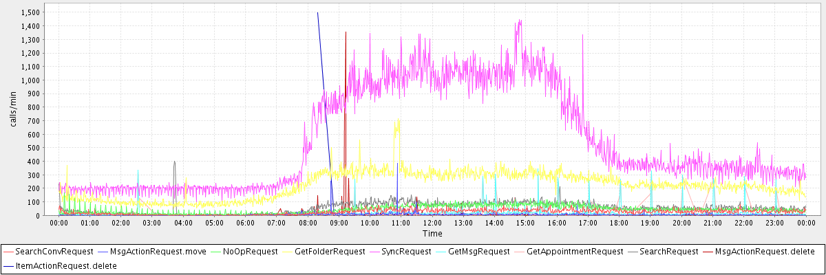 max(SearchConvRequest) = 80.00 max(MsgActionRequest.move) = 384.00 max(NoOpRequest) = 165.00 max(GetFolderRequest) = 716.00 max(SyncRequest) = 1448.00 max(GetMsgRequest) = 345.00 max(GetAppointmentRequest) = 330.00 max(SearchRequest) = 398.00 max(MsgActionRequest.delete) = 1356.00 max(ItemActionRequest.delete) = 1496.00