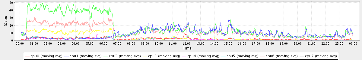 avg(cpu0) = 2.06 avg(cpu1) = 0.38 avg(cpu2) = 0.40 avg(cpu3) = 0.31 avg(cpu4) = 0.23 avg(cpu5) = 0.27 avg(cpu6) = 0.34 avg(cpu7) = 0.28