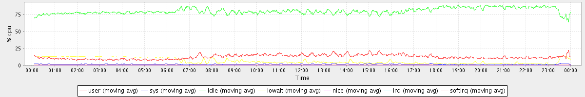 avg(user) = 12.13 avg(sys) = 1.38 avg(idle) = 79.89 avg(iowait) = 6.15 avg(nice) = 0.00 avg(irq) = 0.04 avg(softirq) = 0.40