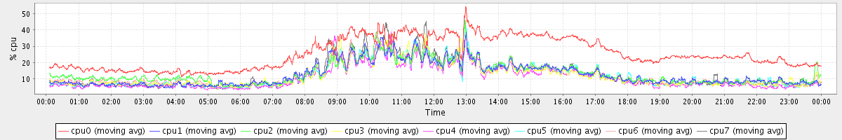 avg(cpu0) = 25.38 avg(cpu1) = 12.60 avg(cpu2) = 13.44 avg(cpu3) = 12.23 avg(cpu4) = 10.77 avg(cpu5) = 12.22 avg(cpu6) = 12.53 avg(cpu7) = 12.71