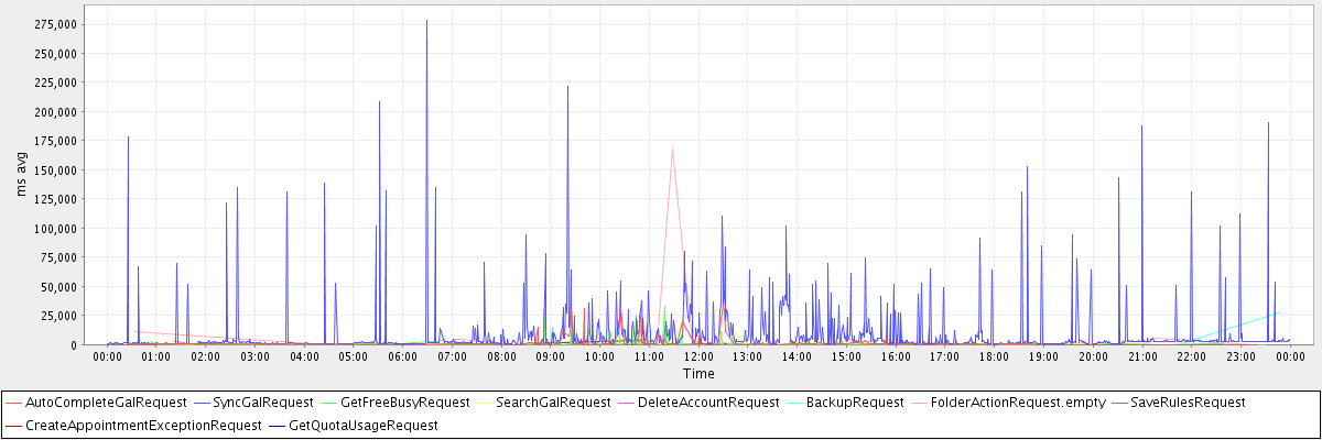 avg(AutoCompleteGalRequest) = 2000.02 avg(SyncGalRequest) = 8862.67 avg(GetFreeBusyRequest) = 1164.62 avg(SearchGalRequest) = 3193.05 avg(DeleteAccountRequest) = 1864.00 avg(BackupRequest) = 13924.00 avg(FolderActionRequest.empty) = 4412.32 avg(SaveRulesRequest) = 1768.50 avg(CreateAppointmentExceptionRequest) = 1265.67 avg(GetQuotaUsageRequest) = 3634.00