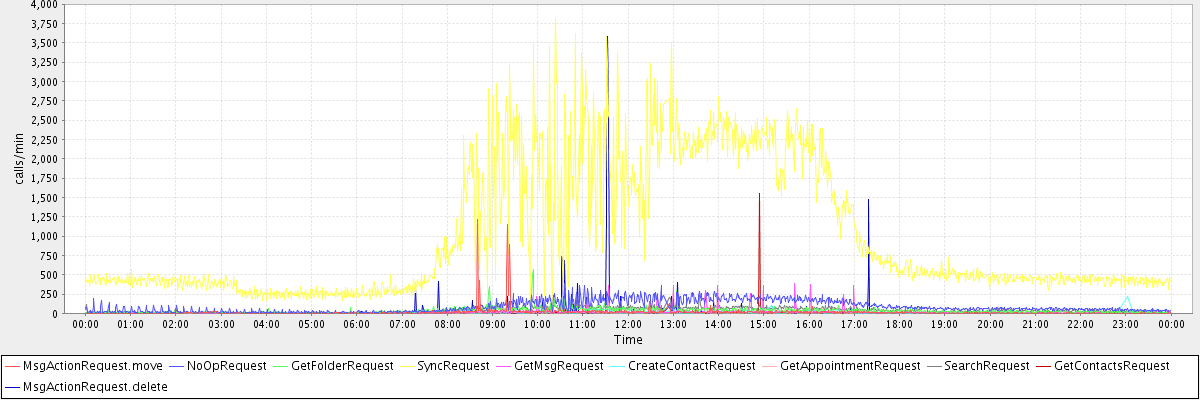 max(MsgActionRequest.move) = 1210.00 max(NoOpRequest) = 386.00 max(GetFolderRequest) = 561.00 max(SyncRequest) = 3811.00 max(GetMsgRequest) = 380.00 max(CreateContactRequest) = 221.00 max(GetAppointmentRequest) = 374.00 max(SearchRequest) = 244.00 max(GetContactsRequest) = 1552.00 max(MsgActionRequest.delete) = 3576.00