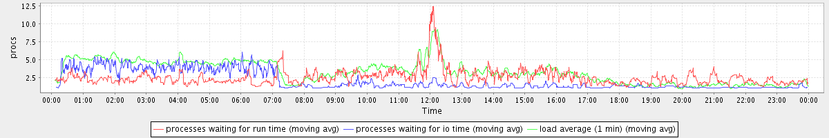 avg(processes waiting for run time) = 1.65 avg(processes waiting for io time) = 1.27 avg(load average (1 min)) = 3.24
