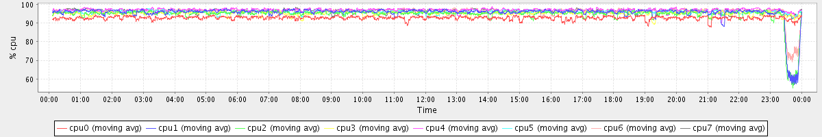 avg(cpu0) = 92.74 avg(cpu1) = 95.41 avg(cpu2) = 94.60 avg(cpu3) = 95.17 avg(cpu4) = 96.95 avg(cpu5) = 95.86 avg(cpu6) = 96.17 avg(cpu7) = 96.37