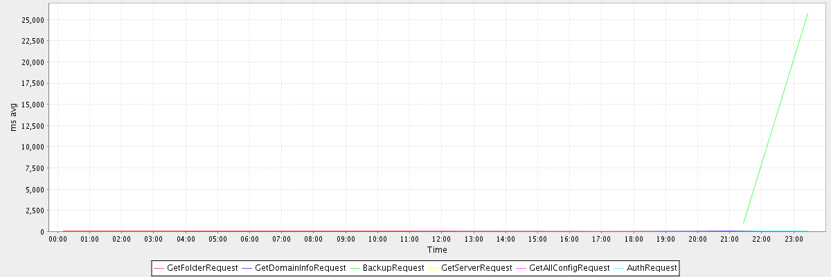 avg(GetFolderRequest) = 38.80 avg(GetDomainInfoRequest) = 2.39 avg(BackupRequest) = 13335.00 avg(GetServerRequest) = 46.00 avg(GetAllConfigRequest) = 1.00 avg(AuthRequest) = 37.75