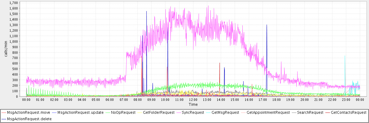 max(MsgActionRequest.move) = 732.00 max(MsgActionRequest.update) = 331.00 max(NoOpRequest) = 268.00 max(GetFolderRequest) = 127.00 max(SyncRequest) = 1646.00 max(GetMsgRequest) = 734.00 max(GetAppointmentRequest) = 705.00 max(SearchRequest) = 148.00 max(GetContactsRequest) = 607.00 max(MsgActionRequest.delete) = 1548.00