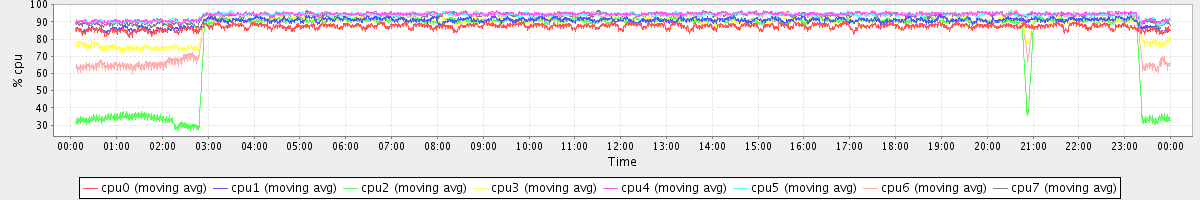 avg(cpu0) = 87.25 avg(cpu1) = 90.44 avg(cpu2) = 82.01 avg(cpu3) = 88.65 avg(cpu4) = 94.07 avg(cpu5) = 93.71 avg(cpu6) = 89.96 avg(cpu7) = 93.39