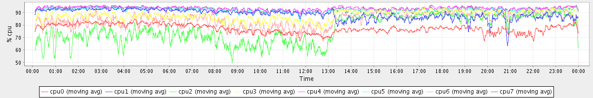avg(cpu0) = 77.16 avg(cpu1) = 88.73 avg(cpu2) = 76.59 avg(cpu3) = 88.00 avg(cpu4) = 93.44 avg(cpu5) = 92.12 avg(cpu6) = 84.37 avg(cpu7) = 92.58