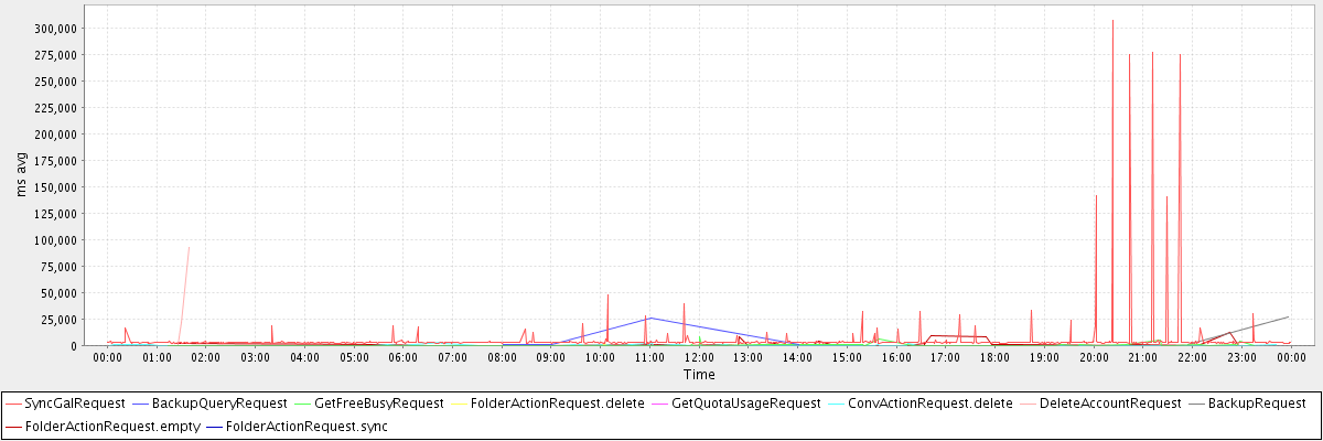 avg(SyncGalRequest) = 5047.15 avg(BackupQueryRequest) = 7197.25 avg(GetFreeBusyRequest) = 666.96 avg(FolderActionRequest.delete) = 404.40 avg(GetQuotaUsageRequest) = 3447.00 avg(ConvActionRequest.delete) = 339.95 avg(DeleteAccountRequest) = 38527.33 avg(BackupRequest) = 13890.00 avg(FolderActionRequest.empty) = 1669.67 avg(FolderActionRequest.sync) = 6156.00