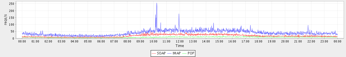 Host zm01.stanford.edu: Mailboxd: Request Rate by Client Protocol