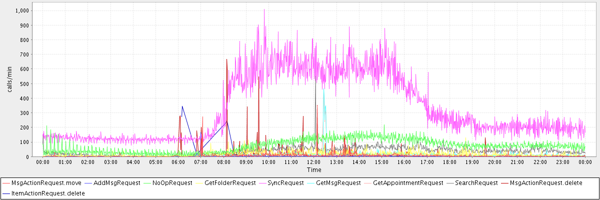 max(MsgActionRequest.move) = 350.00 max(AddMsgRequest) = 168.00 max(NoOpRequest) = 217.00 max(GetFolderRequest) = 130.00 max(SyncRequest) = 1008.00 max(GetMsgRequest) = 466.00 max(GetAppointmentRequest) = 441.00 max(SearchRequest) = 606.00 max(MsgActionRequest.delete) = 665.00 max(ItemActionRequest.delete) = 345.00