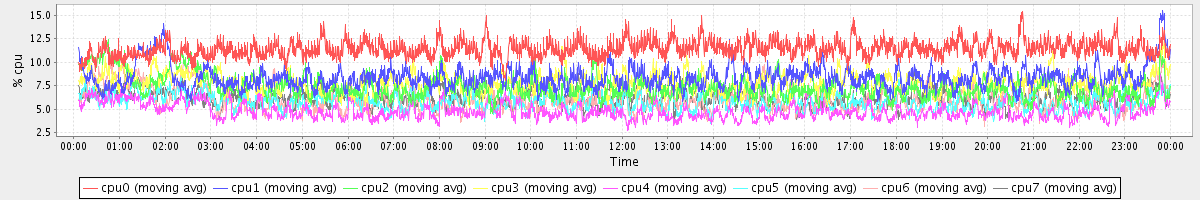 avg(cpu0) = 11.38 avg(cpu1) = 8.37 avg(cpu2) = 7.36 avg(cpu3) = 7.77 avg(cpu4) = 4.77 avg(cpu5) = 5.81 avg(cpu6) = 6.04 avg(cpu7) = 6.24