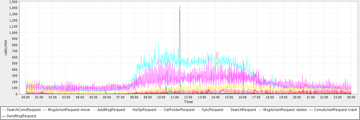 max(SearchConvRequest) = 81.00 max(MsgActionRequest.move) = 121.00 max(AddMsgRequest) = 155.00 max(NoOpRequest) = 298.00 max(GetFolderRequest) = 612.00 max(SyncRequest) = 835.00 max(SearchRequest) = 702.00 max(MsgActionRequest.delete) = 1436.00 max(ConvActionRequest.trash) = 77.00 max(SendMsgRequest) = 56.00